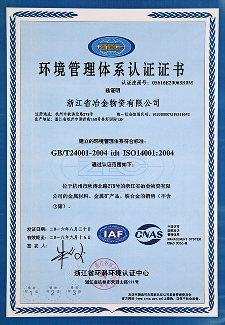環(huán)境管理體系認(rèn)證證書(中)
